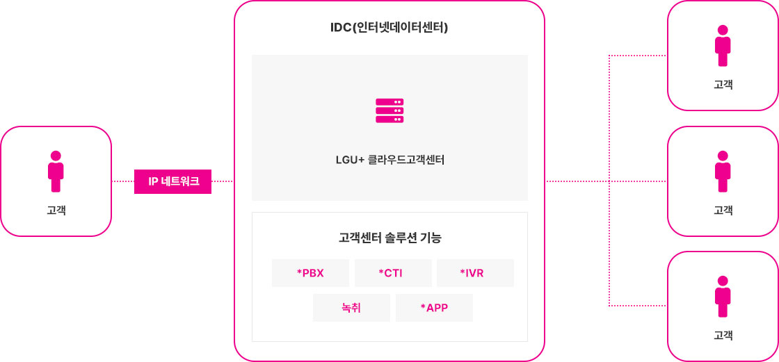 클라우드고객센터는 IDC에 모든 장비가 구축되어 있기 때문에 고객사에 별도 장비 NO! 인터넷연결만으로 OK!